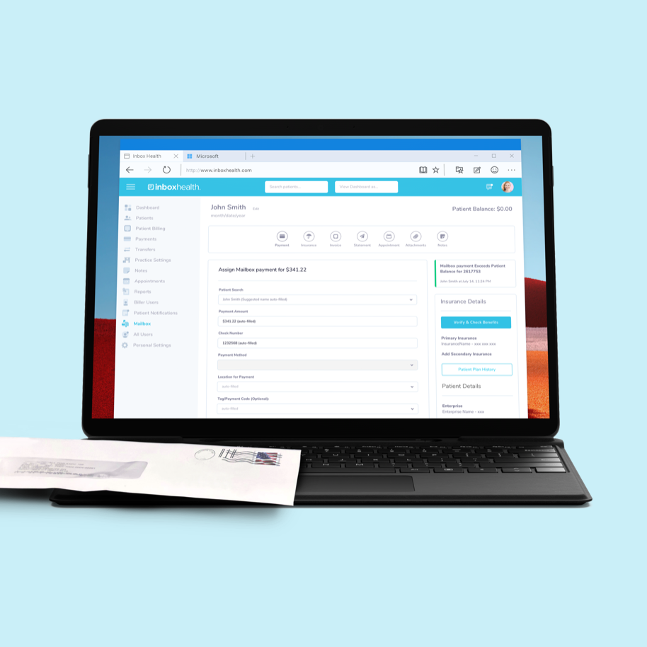 Mailbox is Inbox Health’s lockbox service designed for billing teams that uses technology to automate the work of opening, sorting, depositing, and posting mailed patient payments for you.